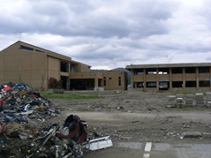 海岸線から500メートル内陸に入った所で、体育館が骨組みだけになっていた。引き水で、車が流されてきたのだろう、体育館の観客席にボコボコニなった車が横たわっていた。